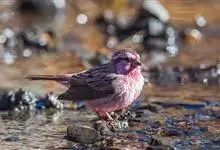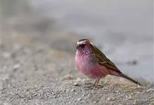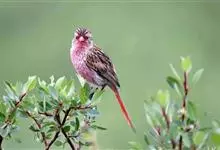 藏朱雀:全长约17-18厘米。雄鸟头部深红色具光辉,喉部暗红色具白色点斑;背部灰白色,各羽具玫瑰红色羽端,形成许多斑纹;腰部淡玫瑰红色;翅暗褐色,沾灰白,羽端沾玫瑰红或灰白色;尾暗棕色,端缘玫瑰红色…全部>>