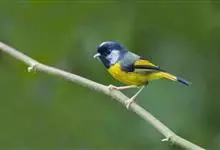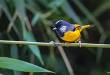 金胸雀鹛是莺科、雀鹛属小型鸟类,体长10-11厘米。头黑色,头顶中央有一道白色中央冠纹,颊和耳羽亦为白色,在黑色的头部极为醒目。上体深灰沾绿。两翅黑色,外侧飞羽有黄色外缘和白色端斑;尾凸状、黑色。…全部>>