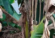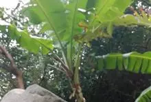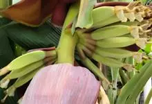 香蕉’),芭蕉科芭蕉属多年生草本植物,植株丛生,有匐匍茎;假茎浓绿有黑色斑点;叶片长圆形,上面为深绿色,无白粉,下面浅绿色;花朵为乳白色或淡紫色;果实呈弯曲的弓状,有棱,果皮为青绿色,…全部>>