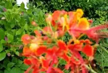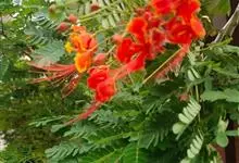 洋金凤 Sw.),豆科小凤花属灌木状或小乔木植物,枝无毛,绿或粉绿色;二回羽状复叶;总状花序伞房状,萼片无毛,花瓣橙红或黄色,圆形,花丝红色,子房无毛,花柱橙黄色;荚果窄而薄,…全部>>