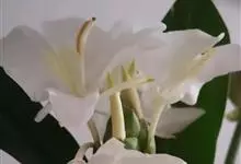 姜花又名野姜花。是姜科姜花属的多年生草本植物,茎高1-2米;叶片长圆状披针形或披针形,叶面光滑,叶背被短柔毛;穗状花序顶生,椭圆形,花芬芳,白色;蒴果卵状三棱形,微黄绿色;种子鲜红色,具橘红色的假种皮。…全部>>