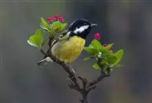 黄腹山雀是雀形目山雀科山雀属鸟类。虹膜褐色或暗褐色;嘴蓝黑色或灰蓝黑色;头、喉胸斑黑色,颊斑、颈后斑白色;上体蓝灰色,腰银白色;翼具两排白色点斑;下胸、腹鲜黄色;尾黑色,…全部>>