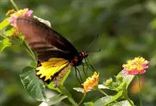 金裳凤蝶是凤蝶科、裳凤蝶属的动物。金裳凤蝶身体呈黑色,头、颈和胸侧有红毛,腹部有黑黄两色相间条纹,雄蝶前翅黑色,具黑天鹅绒光泽,各脉两侧灰白色,后翅金黄色,各室外缘有等腰三角形黑斑1枚,斑内侧有晕,…全部>>