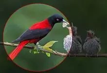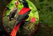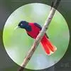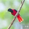 朱鹂:中等鸟类,体长23-28厘米。雄鸟绛紫红色,头、上胸及翼黑色。雌鸟上背及背部深灰色,尾覆羽及尾绛紫红色,腹部及下胸白而密布黑色纵纹。与鹊色鹂幼鸟的区别在上背灰色较深,下体白色较少且纵纹较粗。…全部>>