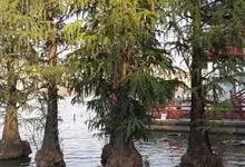 落羽杉 Rich.),杉科落羽杉属木本植物。树干尖削度大,基部通常膨大,具膝状呼吸根,树皮棕色,裂成长条片;一年生小枝褐色,侧生短枝;叶线形;球果具短柄,熟时淡褐黄色,被白粉;花期3月;球果10月成熟。…全部>>