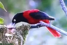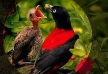 朱鹂:中等鸟类,体长23-28厘米。雄鸟绛紫红色,头、上胸及翼黑色。雌鸟上背及背部深灰色,尾覆羽及尾绛紫红色,腹部及下胸白而密布黑色纵纹。与鹊色鹂幼鸟的区别在上背灰色较深,下体白色较少且纵纹较粗。…全部>>