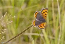 橙灰蝶Lycaena dispar Hauorth,鳞翅目、灰蝶科。这类蝴蝶雌雄异型,雄蝶前翅翅面橙色,顶角向边缘有窄的黑带;后翅基部和臀缘有较宽的黑色区;雌蝶前翅翅面橙色,中室内有2个黑斑,后翅黑…全部>>