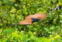 褐翅鸦鹃,是鹃形目鸦鹃科鸦鹃属的鸟类。褐翅鸦鹃的身体为黑色;头颈和胸带蓝紫色金属光泽并具黑亮的羽干纹,下胸至腹部泛金属绿光泽;两翼和肩部为棕栗色,外侧飞羽具暗色羽端,尾羽闪铜绿色光泽;虹膜赤红色,…全部>>