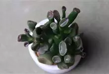 筒叶花月,是景天科青锁龙属的多年生草本植物。植株多分株,灌木状,茎较粗壮,圆柱形,表皮灰褐色;叶片肉质,互生,呈圆筒状,簇生于茎或分枝顶端,叶端呈斜截形,截面为椭圆形;花呈星状,淡白色;花期秋季。…全部>>