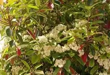 石楠 Kalkman),是蔷薇科石楠属的常绿乔木,高5~12米,株型紧凑,树冠圆球形。树枝为褐灰色;鳞片为褐色,没有毛;叶片革质,长椭圆至侧卵状椭圆形,有锯齿,新叶红色光亮。复伞房花序,白色小花,…全部>>