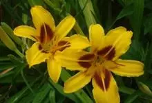 金娃娃萱草:是萱草的人工栽培的园艺品种。地下具根状茎和肉质肥大的纺锤状块根。叶基生,条形,排成两列,长约25厘米,宽1厘米。株高30厘米,花莛粗壮,高约35厘米。螺旋状聚伞花序,花7至10朵。…全部>>