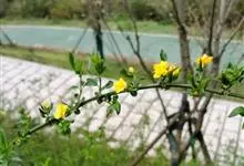 迎春花,木犀科素馨属的多年生木本植物,小枝细长直立或者呈拱形下垂;叶片呈卵形或椭圆形;花单生于叶腋处,苞片呈披针形或椭圆形,花冠为金黄色,花瓣通常为倒卵形或椭圆形;花期在6月。…全部>>