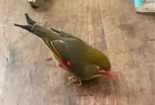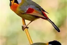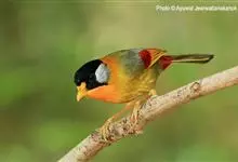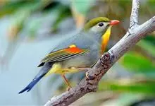 银耳相思鸟小型鸟类,体长14~18厘米。头顶黑色,耳羽银灰色,前额橙黄色;外侧飞羽橙黄色,基部朱红色,极为鲜艳、醒目。尾圆形,尾上、尾下覆羽朱红色,尾暗灰褐色,外侧尾羽橙黄色,其余上体橄榄绿或橄榄黄色。…全部>>