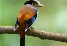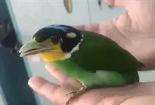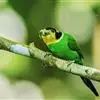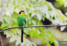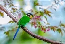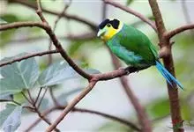 长尾阔嘴鸟是雀形目阔嘴鸟科的鸟类,体长约25厘米,是绿色阔嘴鸟。形长的楔形尾蓝色,喉及脸黄色,顶冠及颈背黑色。两翼黑并具显著的蓝色斑块。头顶具蓝色小点斑,眼后有一黄色点斑。亚成鸟多为绿色。结群活动于…全部>>