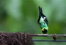 三宝鸟佛法僧科三宝鸟属的鸟类,为佛法僧目三宝鸟属下的一种中小型攀禽,共有10个亚种,体长26-29厘米,体重107-194克。通体蓝绿色,头和翅较暗,呈黑褐色,初级飞羽基部具淡蓝色斑,飞翔时甚明显。…全部>>