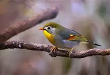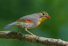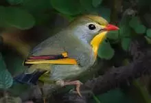 银耳相思鸟小型鸟类,体长14~18厘米。头顶黑色,耳羽银灰色,前额橙黄色;外侧飞羽橙黄色,基部朱红色,极为鲜艳、醒目。尾圆形,尾上、尾下覆羽朱红色,尾暗灰褐色,外侧尾羽橙黄色,其余上体橄榄绿或橄榄黄色。…全部>>