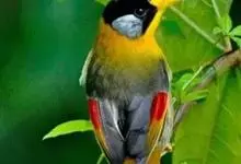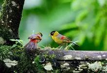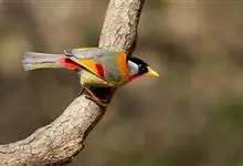 银耳相思鸟小型鸟类,体长14~18厘米。头顶黑色,耳羽银灰色,前额橙黄色;外侧飞羽橙黄色,基部朱红色,极为鲜艳、醒目。尾圆形,尾上、尾下覆羽朱红色,尾暗灰褐色,外侧尾羽橙黄色,其余上体橄榄绿或橄榄黄色。…全部>>