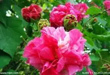 木芙蓉,锦葵科木槿属落叶灌木或小乔木。小枝上有细绒毛;叶片为卵状心形,托叶为披针形,常早落;花单生,花萼为钟形,花冠初为白色或淡红色,后逐渐变为深红色;果实为扁球形,有淡黄色的毛附着。花期8到10月。…全部>>