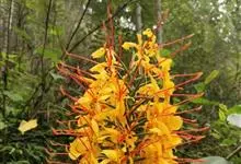 黄姜花:姜科,姜花属多年生草本草本芳香花卉,秋冬季开花,穗状花序,长圆形;苞片长椭圆形,覆瓦状排列,每一苞片内有花3-5朵;花深黄色,形似蝴蝶,气味芬芳纯正,沁人心脾;唇瓣倒心形,黄色,…全部>>