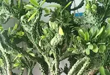 虎刺梅:别称铁海棠,是蔓生灌木植物。茎多分枝,长60-100厘米,直径5-10毫米,具纵棱,密生硬而尖的锥状刺,刺长1-1.5厘米,直径0.5-1.0 毫米,常呈3-5列排列于棱脊上,呈旋转。叶互生…全部>>