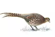 雉鸡:鸟纲、雉科、雉属的一种走禽,共有30个亚种。体形较家鸡略小,但尾巴却长得多。雄鸟和雌鸟羽色不同,雄鸟羽色华丽,多具金属反光,头顶两侧各具有一束能耸立起而羽端呈方形的耳羽簇,…全部>>