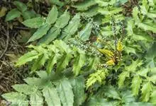 十大功劳 Fedde),小檗科十大功劳属常绿灌木植物。叶子较大且较多,呈椭圆形,绿色,表面光滑无毛,叶柄较长;花朵较小,呈多边形,黄色,花瓣对称分布,表面有绒毛;果实呈圆形,褐色,…全部>>