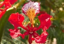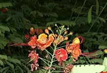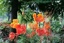 洋金凤 Sw.),豆科小凤花属灌木状或小乔木植物,枝无毛,绿或粉绿色;二回羽状复叶;总状花序伞房状,萼片无毛,花瓣橙红或黄色,圆形,花丝红色,子房无毛,花柱橙黄色;荚果窄而薄,…全部>>