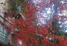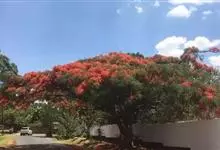 凤凰木 Raf.) ,别名火树、红花楹、凤凰花、火凤凰、金凤花、红楹,是豆科凤凰木属高大落叶乔木,树皮灰褐色,粗糙。二回偶数羽状复叶互生,矩圆形,两面均被柔毛。伞房式总状花序,花大,花瓣5枚,圆形,…全部>>