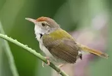 普通缝叶莺,是雀形目鹅科莺亚科缝叶莺属一种。体长10-14厘米,体重7-10克,雄鸟前额棕红,头顶至枕棕橄榄褐,上体橄榄绿染黄,飞羽及尾羽暗褐;繁殖期雄鸟的中央尾羽特形延长,下体淡皮黄白色。…全部>>