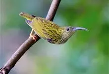 纹背捕蛛鸟:为太阳鸟科捕蛛鸟属的鸟类。是太阳鸟科中体型较大的一种,体重25-45克,体长160-210毫米。嘴粗长而尖且向下弯曲。上体橄榄黄色具黑色中央斑纹。下体淡黄白色满布黑色纵纹,尾具黑色次端斑。…全部>>