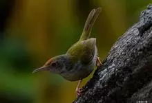 普通缝叶莺,是雀形目鹅科莺亚科缝叶莺属一种。体长10-14厘米,体重7-10克,雄鸟前额棕红,头顶至枕棕橄榄褐,上体橄榄绿染黄,飞羽及尾羽暗褐;繁殖期雄鸟的中央尾羽特形延长,下体淡皮黄白色。…全部>>