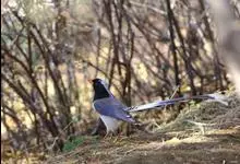 红嘴蓝鹊,别名山鹊、长尾鹊,是鸦科蓝鹊属的一种观赏性较强的大型鸣禽。该物种为体长54~65cm,头、颈、喉和胸黑色,头顶至后颈有一块白色至淡蓝白色或紫灰色块斑,其余上体紫蓝灰色或淡蓝灰褐色。尾长呈凸状,…全部>>
