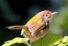 普通缝叶莺,是雀形目鹅科莺亚科缝叶莺属一种。体长10-14厘米,体重7-10克,雄鸟前额棕红,头顶至枕棕橄榄褐,上体橄榄绿染黄,飞羽及尾羽暗褐;繁殖期雄鸟的中央尾羽特形延长,下体淡皮黄白色。…全部>>