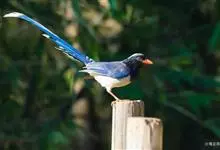红嘴蓝鹊,别名山鹊、长尾鹊,是鸦科蓝鹊属的一种观赏性较强的大型鸣禽。该物种为体长54~65cm,头、颈、喉和胸黑色,头顶至后颈有一块白色至淡蓝白色或紫灰色块斑,其余上体紫蓝灰色或淡蓝灰褐色。尾长呈凸状,…全部>>