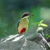 绿胸八色鸫:是雀形目八色鸫科的鸟类,共有12个亚种。体长为16-18厘米,体重65-69克。体型圆胖,尾短,腿长。头黑,上体绿色,两翼深色而具白色斑纹,头顶至后枕深褐,胸及腹部苹果绿,臀亮红。…全部>>