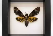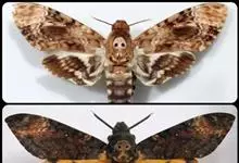 鬼脸天蛾,是鳞翅目天蛾科面形天蛾属动物。成虫翅展100~125毫米,体黑褐色;胸背有骷髅形斑纹;卵圆球形,直径约2毫米,淡黄绿色,表面光滑;老熟幼虫体长70~90毫米,蛹体长约56毫米;前翅为褐色,…全部>>