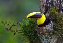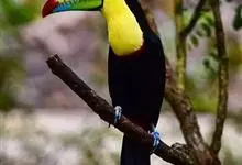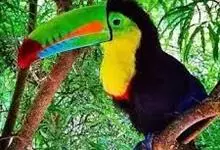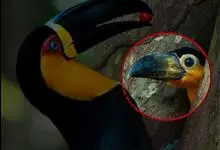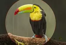 鵎鵼:又名巨嘴鸟。体长约67厘米,嘴巨大,长17~24厘米,宽5~9厘米,形似嘴刀。嘴非常漂亮,上半部黄色,略呈淡绿色,下半部呈蔚蓝色,喙尖点缀着一点殷红。眼睛四周镶嵌着天蓝色羽毛眼圈,胸脯橙黄色,…全部>>