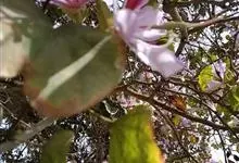 洋紫荆:落叶乔木;树皮暗褐色,近光滑;幼嫩部分常被灰色短柔毛;枝广展,硬而稍呈之字曲折,无毛。叶近革质,广卵形至近圆形,宽度常超过于长度,先端2裂达叶长的1/3,裂片阔,钝头或圆,两面无毛或下面略被…全部>>
