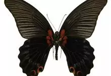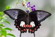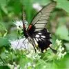 玉斑凤蝶Papilio helenus 别名白纹凤蝶,是凤蝶科凤蝶属美凤蝶亚属大型种类。雌雄同型;体翅皆黑色,后翅正面中室外有3个并列的白色斑,亚外缘有1列模糊的新月形红色斑,…全部>>