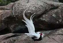 白鹇,是鸡形目雉科鹇属的一种留鸟。雄鸟上体白色并具黑色纹,下体黑色,头顶具黑色长羽冠,尾白而长;雌鸟体型较小,以橄榄褐色为主,下体具白色或皮黄色细纹;虹膜褐色,眼周具红色裸皮,喙黄色,脚鲜红色。…全部>>