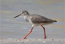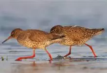 红脚鹬:体长28厘米,上体褐灰,下体白色,胸具褐色纵纹。飞行时腰部白色明显,次级飞羽具明显白色外缘。尾上具黑白色细斑。虹膜黑褐色,嘴长直而尖,基部橙红色,尖端黑褐色。脚较细长,亮橙红色,…全部>>