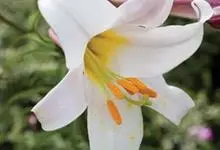 麝香百合:在中国台湾亦称铁炮百合。鳞茎球形或近球形,高2.5-5厘米;鳞片白色。茎高45-90厘米,绿色,基部为淡红色。叶散生,披针形或矩圆状披针形,两面无毛。花单生或2-3朵;花喇叭形,白色,筒外…全部>>