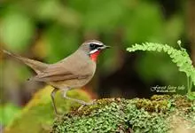 红点颏:是鸟纲、鹟科的鸣禽。又名西伯利亚歌鸲。体长14-17厘米,体重16-27克。雄鸟头部、上体主要为橄榄褐色。眉纹白色。颏部、喉部红色,周围有黑色狭纹。胸部灰色,腹部白色。雌鸟颏部、喉部不呈赤红色,…全部>>