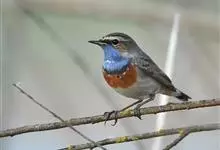 蓝点颏亦称“蓝喉歌鸲”,通称蓝靛颏儿。身体大小和麻雀相似,体长12-13厘米,体重17-18克。头部、上体主要为土褐色。眉纹白色。尾羽黑褐色,基部栗红色。颏部、喉部辉蓝色,下面有黑色横纹。下体白色。…全部>>