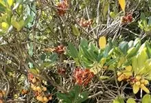 海桐 W. T. Aiton)是海桐科海桐属常绿灌木或小乔木;嫩枝被褐色柔毛;叶聚生于枝顶,浓密且有光泽;伞形花序顶生,花为白色,气味芳香;蒴果呈球形,三瓣裂开,红色;花期3-5月,果熟期9-10月。…全部>>