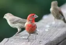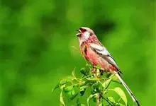 普通朱雀是雀形目雀科朱雀属鸟类,又名红朱雀、马料、青麻料。雄鸟上体红色,下体淡红色;头部、喉部、胸部及腰部亮红色;背部褐色染红色;两翼及尾黑褐色,羽缘染红色。雌鸟上体橄榄褐色,下体近白色,…全部>>
