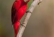 血雀雀科朱雀属鸟类,体重36-49克;体长155-182毫米。雄鸟除眼先、翼与尾为黑色外,通体为鲜红色;嘴鲜黄;雌鸟暗橄榄绿色,羽端较淡或带黄色;腰鲜黄;嘴较暗。虹膜褐色;嘴黄色;腿和脚褐色。…全部>>