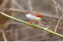 金眼鹛雀是莺科、鹛雀属小型鸟类。体长16-20厘米。头顶和上体棕褐色,两翅表面肉桂红色,尾褐色具明暗相间横斑。眼周金黄色,眼先、眼上、眼下、颊以及颏、喉和上胸概为白色,其余下体茶黄色,脚橙黄色。…全部>>