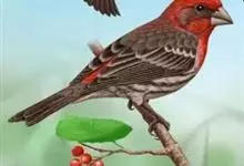 普通朱雀是雀形目雀科朱雀属鸟类,又名红朱雀、马料、青麻料。雄鸟上体红色,下体淡红色;头部、喉部、胸部及腰部亮红色;背部褐色染红色;两翼及尾黑褐色,羽缘染红色。雌鸟上体橄榄褐色,下体近白色,…全部>>