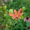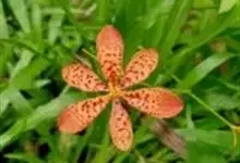 射干 Redouté)是鸢尾科射干属多年生草本植物。根状茎为不规则的块状,斜黄色或黄褐色;花橙红色,散生紫褐色的斑点;花药呈条形;子房下位,倒卵形;蒴果倒卵形或长椭圆形;种子圆球形,黑紫色,有光泽。…全部>>